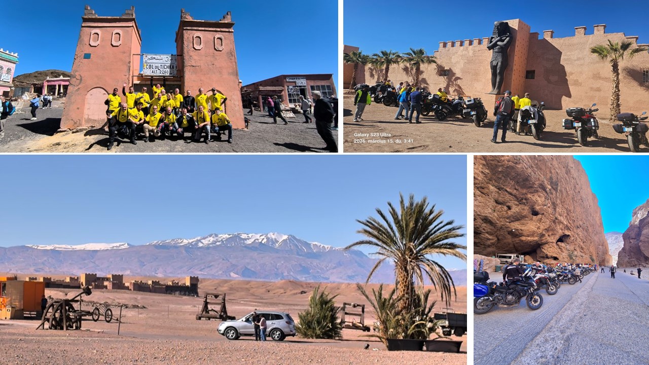 4. nap: Erre a napra csak rövid etapot terveztünk, hogy szusszanjunk kicsit. És ha már Marrákesben vagyunk, nem mehetünk el onnan anélkül, hogy délelőtt be ne kukkantanánk a híres Jemaa El-Fnaa piacra. Ez a város szíve-lelke, ami napközben kígyóbűvölők, hennatetováló-művészek, árusok kedvelt helye, míg éjszaka bárányból készült ételeket és frissen facsart narancslevet kínálnak. Ebéd után motorra pattantunk és dél felé indulunk, egyenesen neki az Atlasz-hegységnek. Az itt átvezető út sokáig az egyetlen út volt, ami átszelte ezt a hegyláncot, legmagasabb pontja a tizi n'Tichka hágó, ami 2260 méteres magasságban bukik át az Atlasz-hegységen. Afrika hegyeit ebben a magasságban sokáig hó fedi, ami lenyűgöző látványt nyújt a sivatag háttereként. Az Atlasz déli oldalán nagyon hamar elértük a sivatag szélét, tevékkel, homokdűnékkel. Szállásunk is itt volt, a sivatag peremén, Ouarzazate városában.