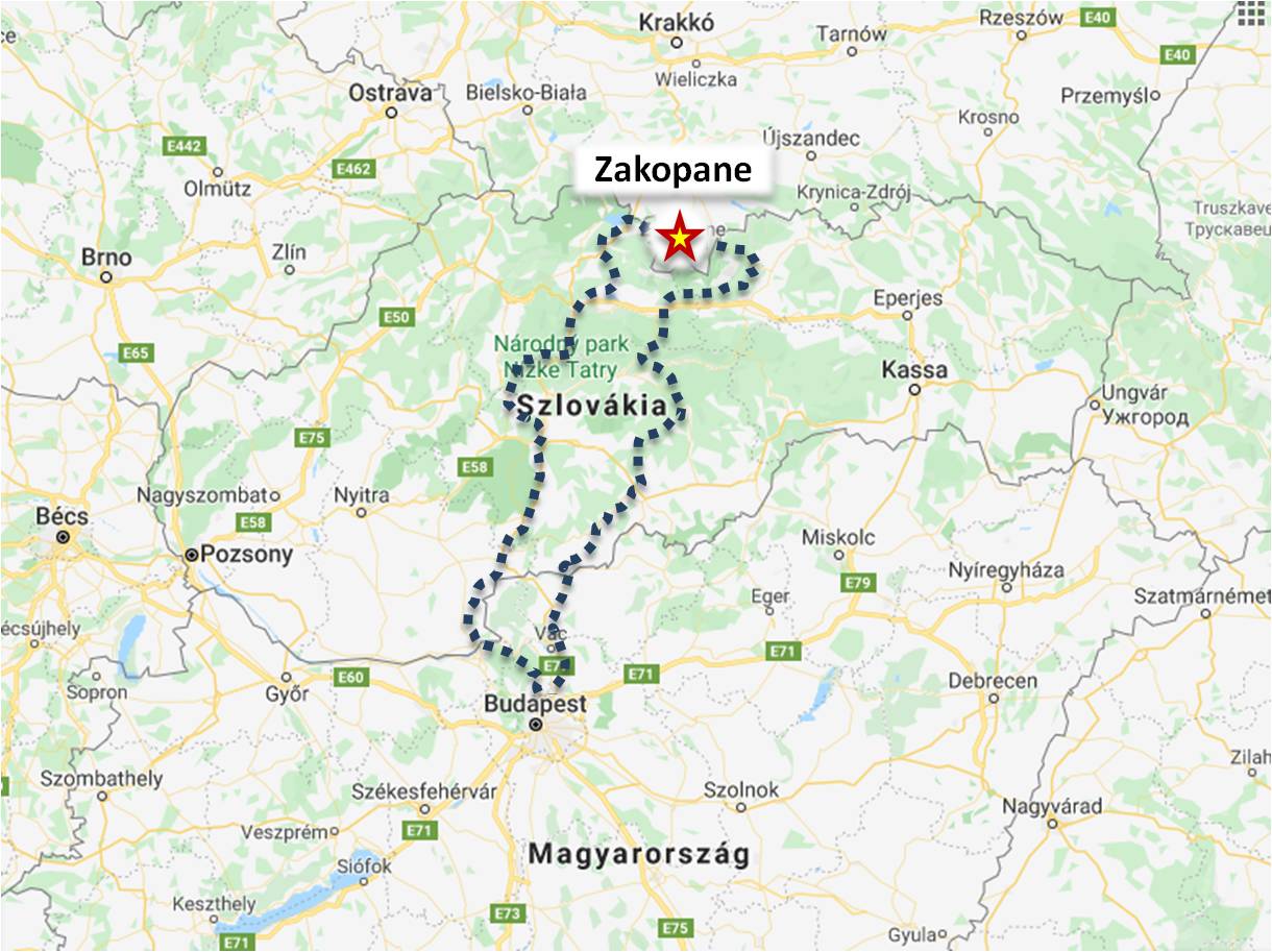 Ez a túra már a magyarországi területen is élvezetes motorozást kínál, hiszen a Pilisen átmotorozva Esztergomnál hagyjuk el a magyar utakat. A szlovák oldalon ismét kellemes kanyarok várnak minket. A selmecbányai rövid pihenő után a teplicei szerpentin tetején egy igazi felvidéki ebédet fogyaszthatunk el: sztrapacskát. Folytatva utunkat Rózsahegy és Liptószentmiklós érintésével Lengyelország felé fordulunk. Átmotorozunk néhány síterepet összekötő szerpentinen, ahol lesz mit fotózni bőven. A késő délutáni órákban érünk majd Zakopane belvárosába.