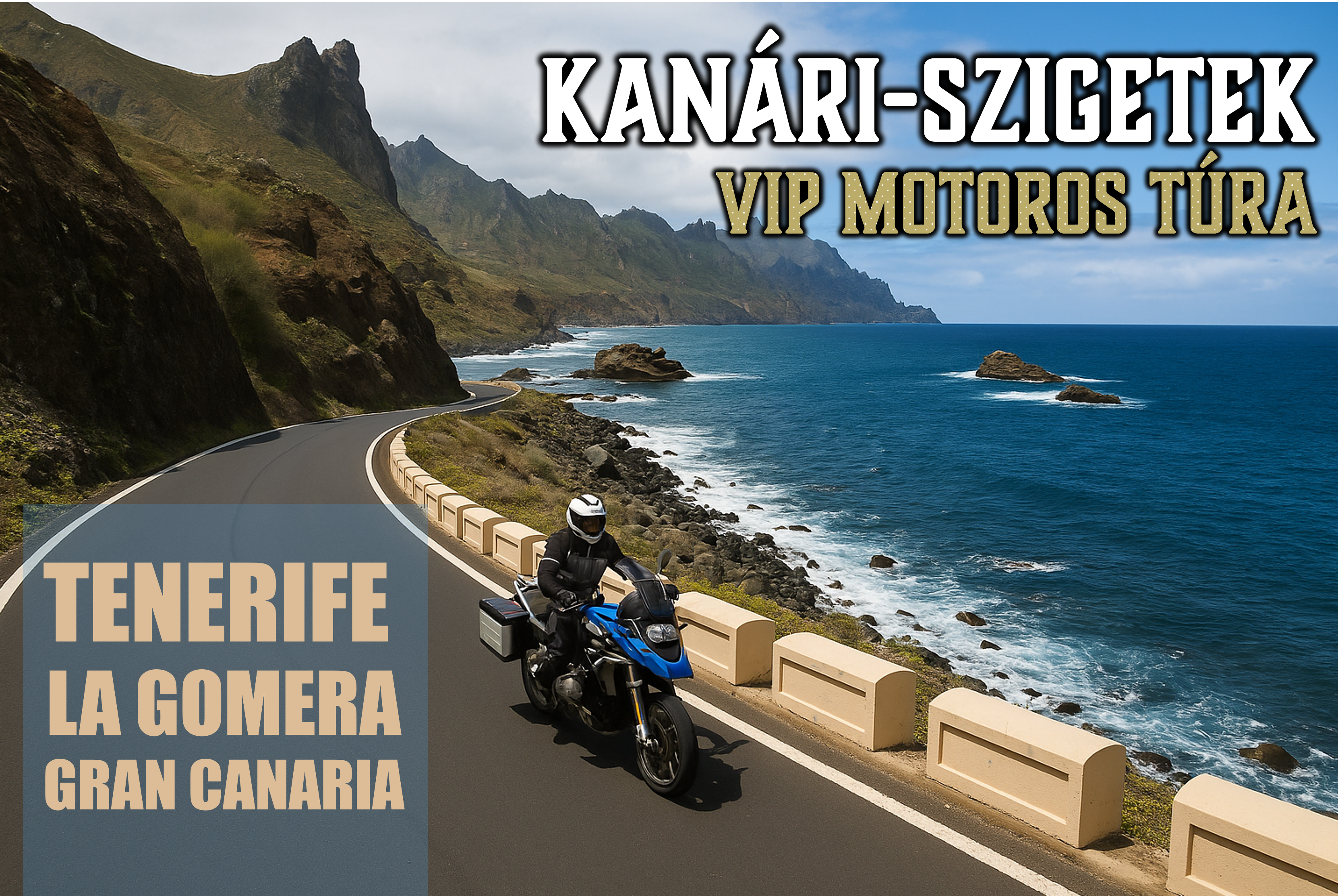 Egy túra, három sziget! Ha úgy érzed vége a motoros szezonnak, tévedsz! Ezen a túrán elviszünk téged a Kanári-szigetekre, az örök tavasz szigeteire. Elképesztő kanyargós utak, kiváló minőségű aszfalt és kedves, barátságos emberek várnak. Tenerife hegyei páratlanok a maguk nemében, pazar kilátással, változatos növényvilággal kecsegtetnek bennünket. És ha már itt vagyunk, bejárjuk mindhárom szigetet, Gran Canariát, Tenerifét és La Gomerát is.